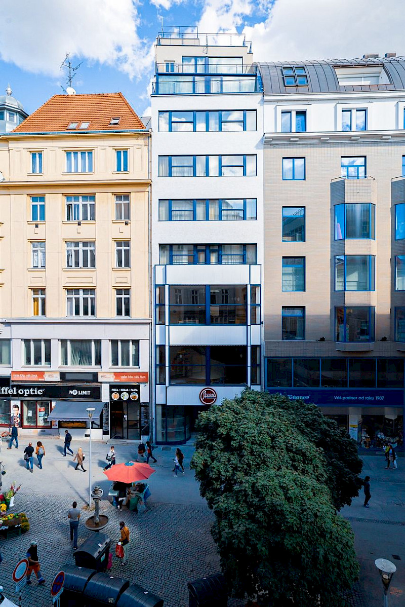 Es handelt sich um einen der schmalsten Hotelkomplexe Europas, entworfen vom tschechischen Architekten Bohuslav Fuchs. Das Hotel wurde 1926/27 geplant, 1928 erbaut und 1929 eingerichtet. Das zehnstöckige Reihenhaus, errichtet auf einem schmalen und tiefen Grundstück von 8 x 34 Metern, ist 40 Meter hoch und bietet von der Dachterrasse einen faszinierenden Blick auf Schloss Špilberk, die Kathedrale St. Peter und Paul auf dem Petrov-Platz und die gesamte Stadt Brünn. Das Gebäude ist ein außergewöhnliches Bauwerk und ein nationales Kulturdenkmal.