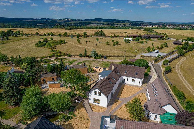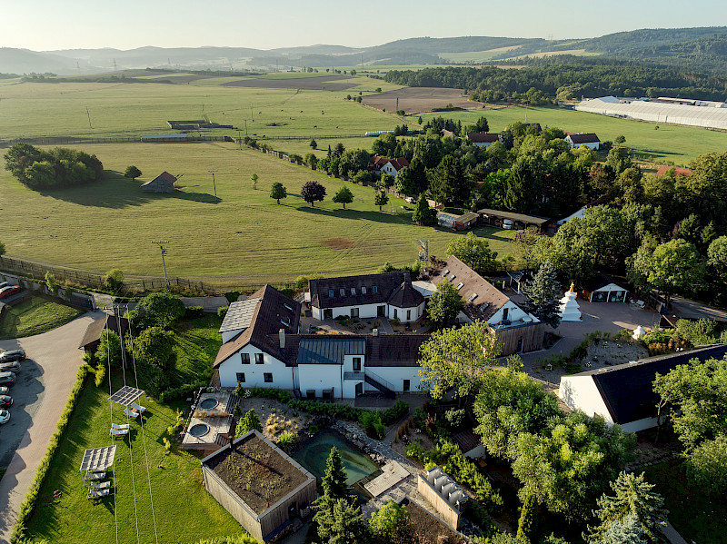 Poptat prostorAuf einem 12 Hektar großen Naturgrundstück mit Wiese, Feld und Obstgarten finden Sie ein Wellnesshotel.