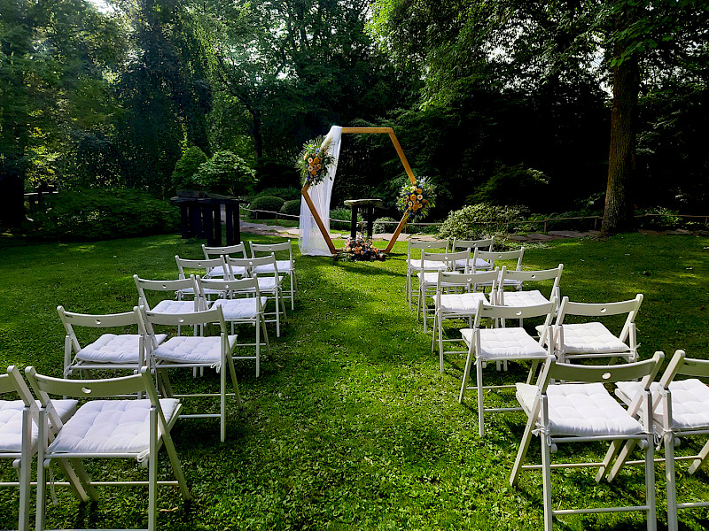 V ceně pronájmu je pro svatby stolek s ubrusem pro oddávajícího, 20 židlí pro hosty s bílými podsedáky, 25 ks vstupenek do Botanické zahrady.