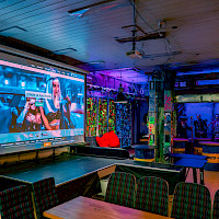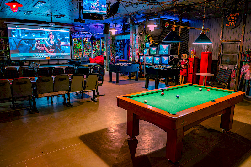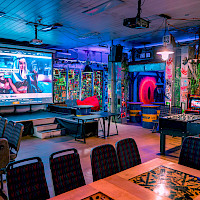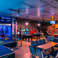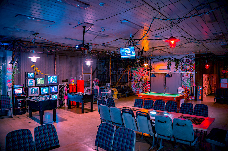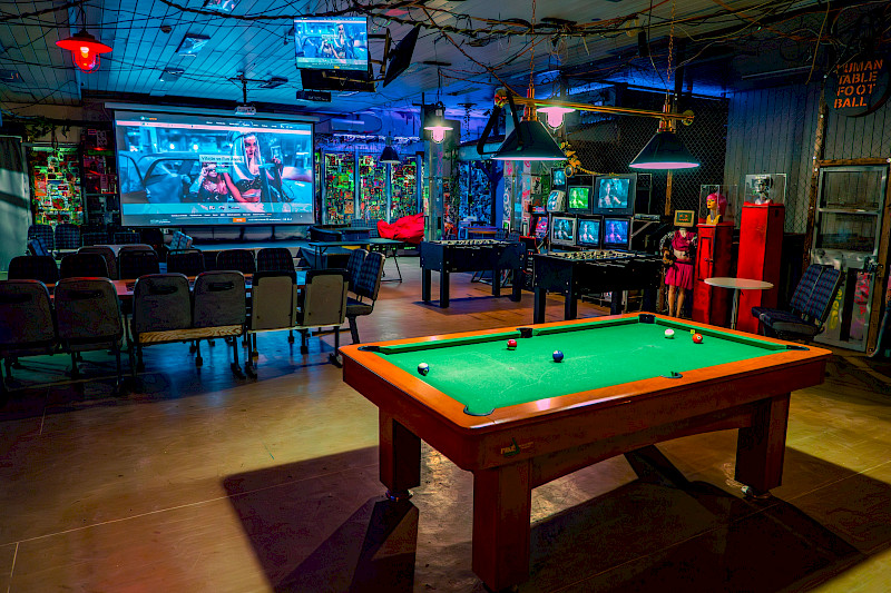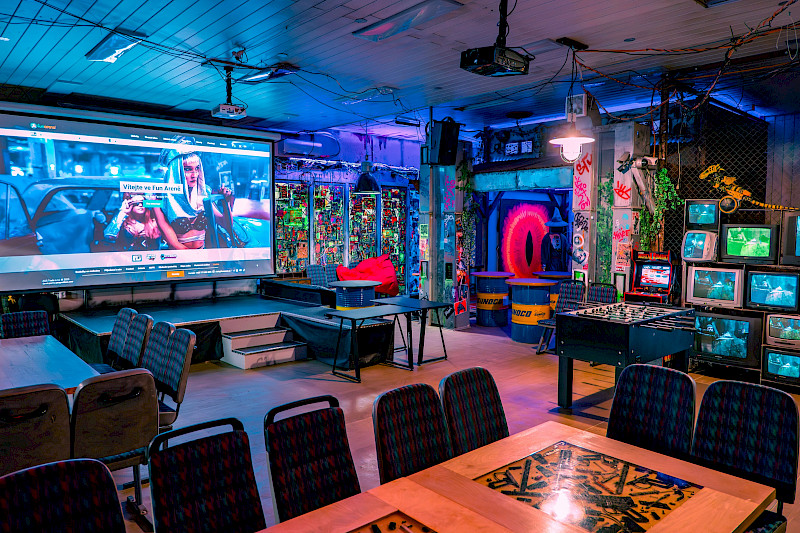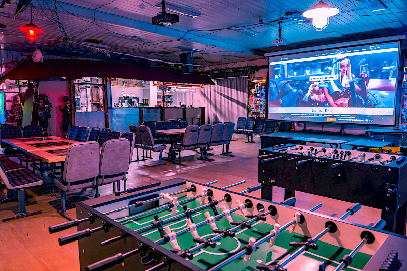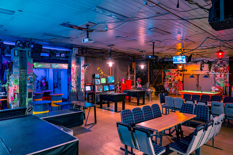 Poptat prostorProstor, který si můžete představit jako malé město z dystopického světa cyberpunku, plné neonů, které vás zavedou k tradičním i naprosto netradičním aktivitám – od HADO v rozšířené realitě, přes házení sekerou až po lidský stolní fotbal či bitvy robotů. Najdete tu i malé náměstí s barem, kde to žije od rána do noci, nebo klasickou hernu s kulečníkem, stolními fotbálky a profi šipkami.