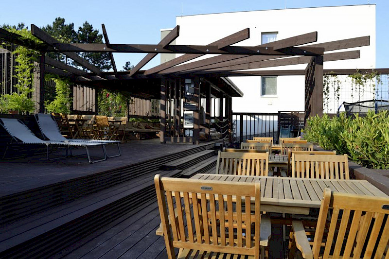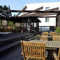 V nabídce je možné v teplejších dnech rezervovat slunnou terasu se stylovým sezením pod pergolou a dětským hřištěm nebo krbové posezení s udírnou.