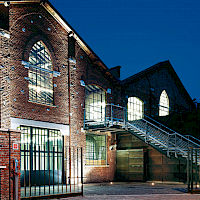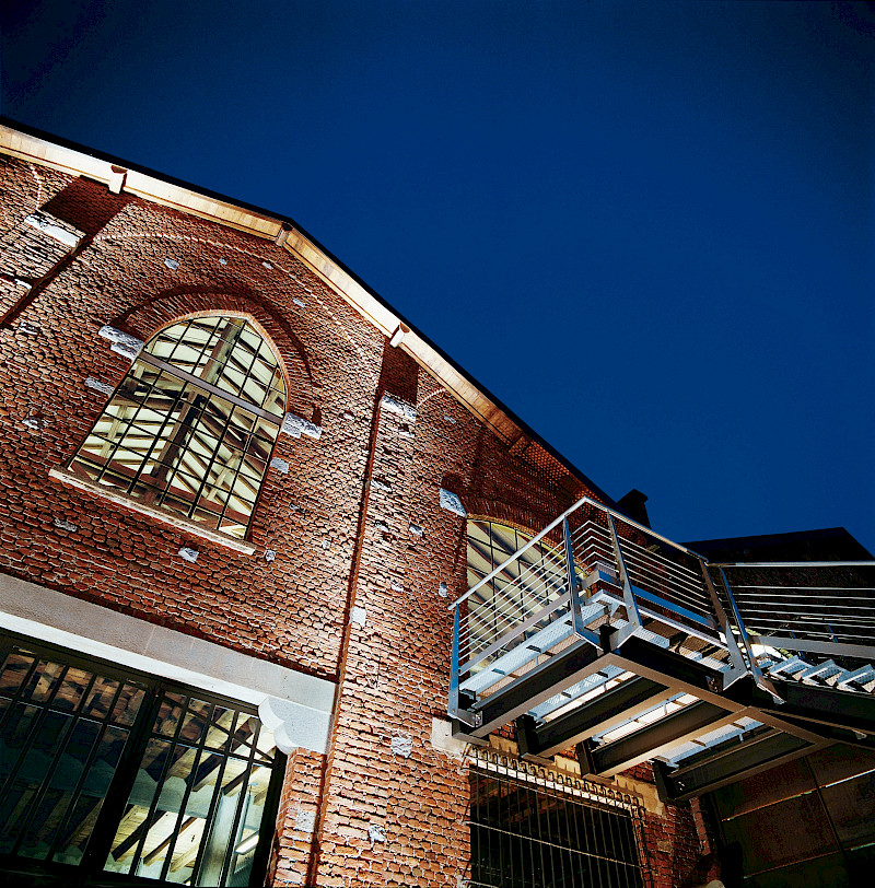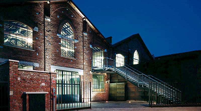 Autentický venkovní dvůr u hlavního vstupu, typický industriální dvůr s historickými prvky, dlážděný a osvětlený, ideální pro akce pod širým nebem.