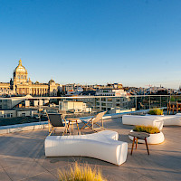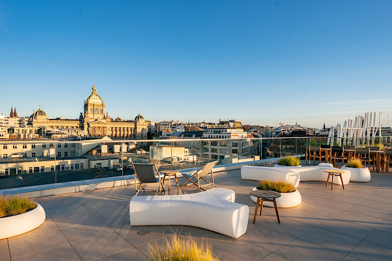 Exkluzivní střešní kavárna s terasou s panoramatickým výhledem na Prahu a Pražský hrad.