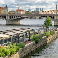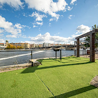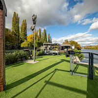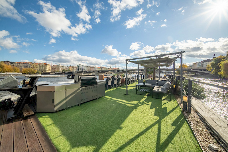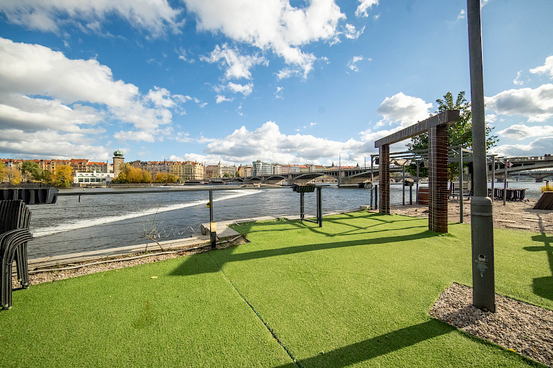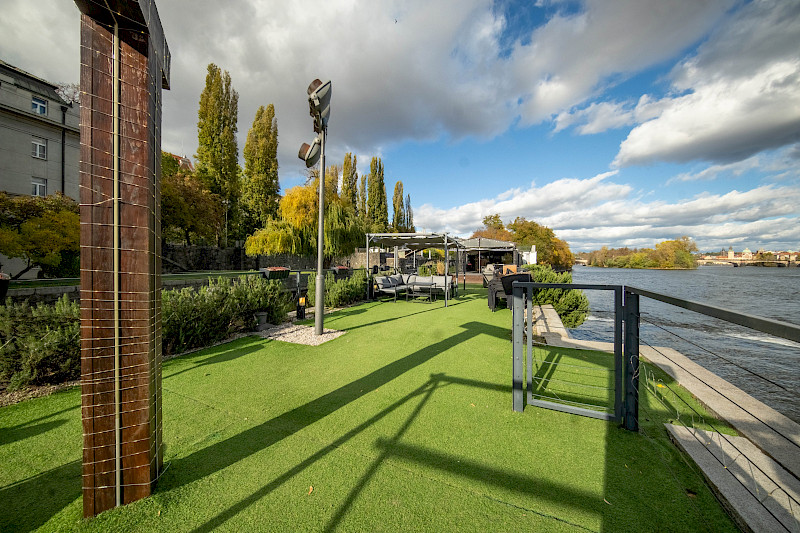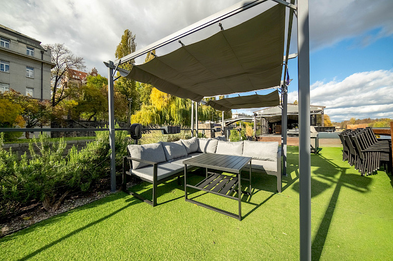 Venkovní chill-out prostor přímo u řeky, ideální pro letní akce, BBQ a neformální setkání