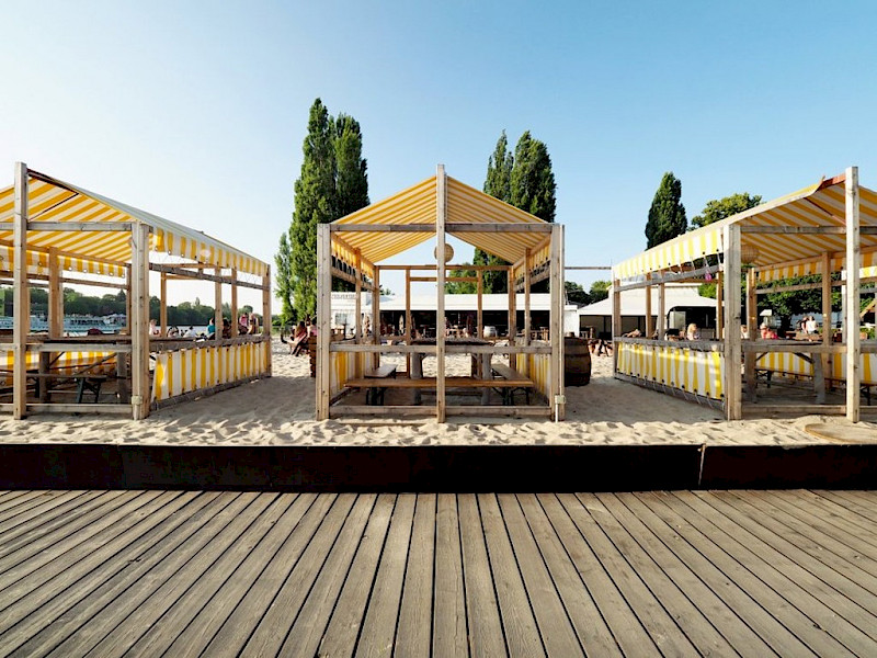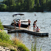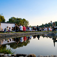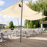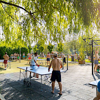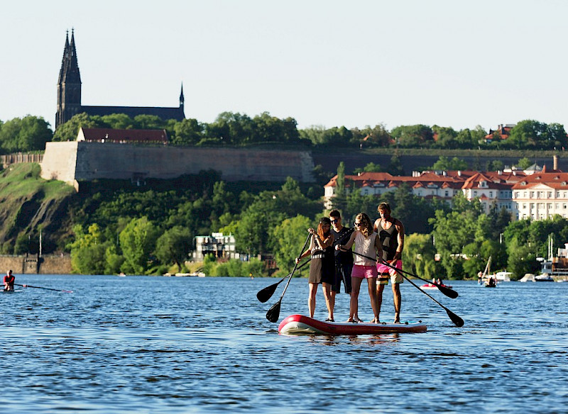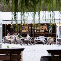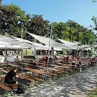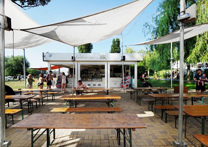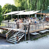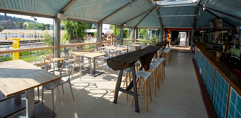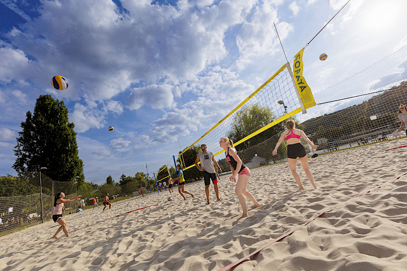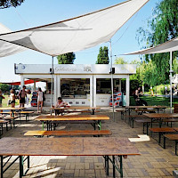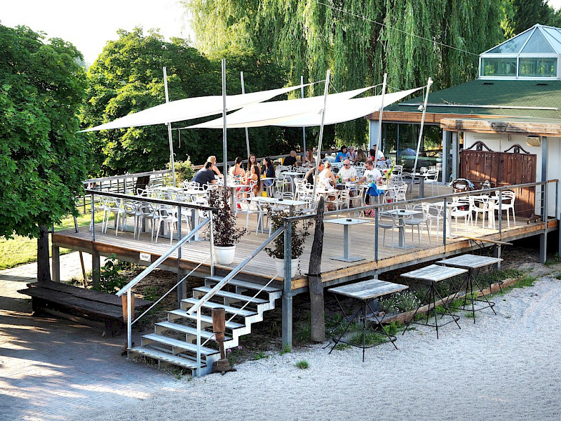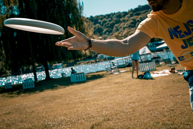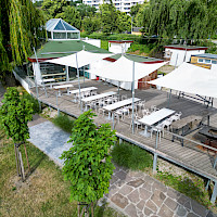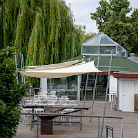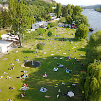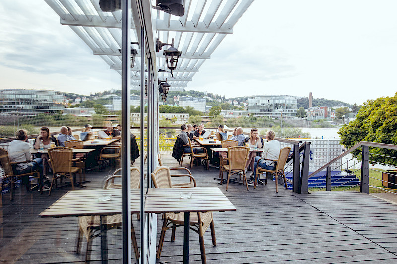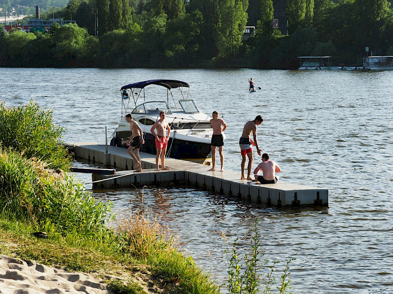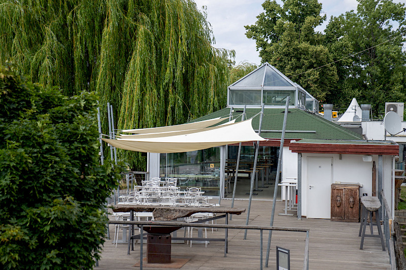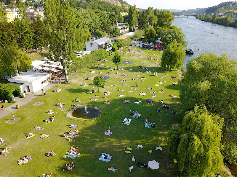 Travnaté prostory s posezením a sportovními aktivitami na břehu Vltavy. Vhodné pro party, prezentace, open-air promítání, svatby, oslavy.