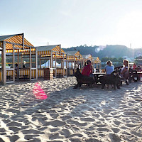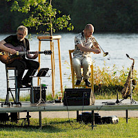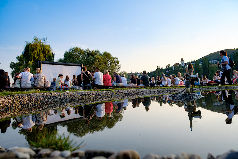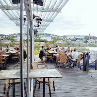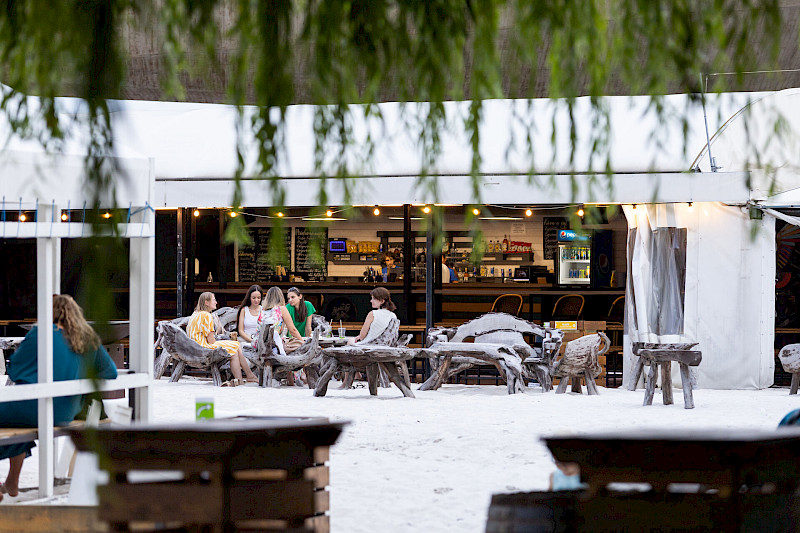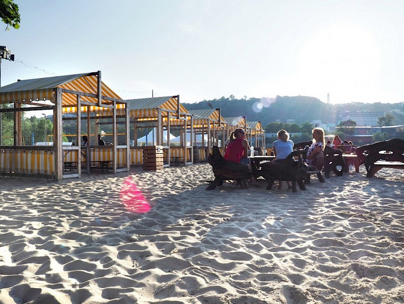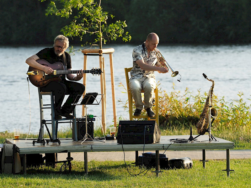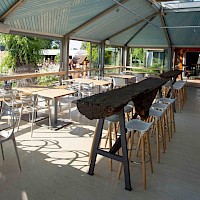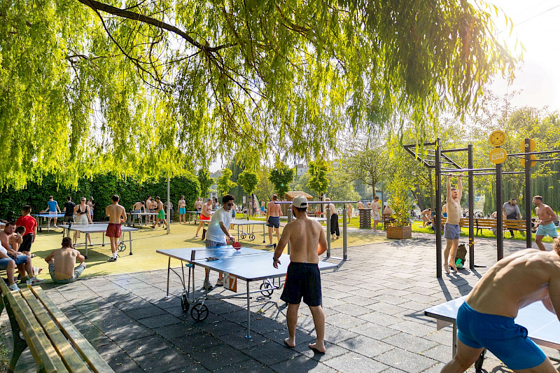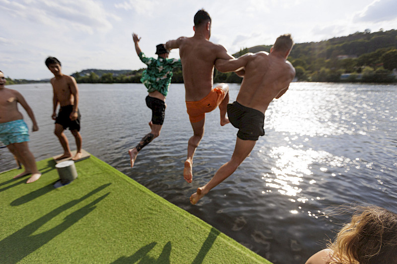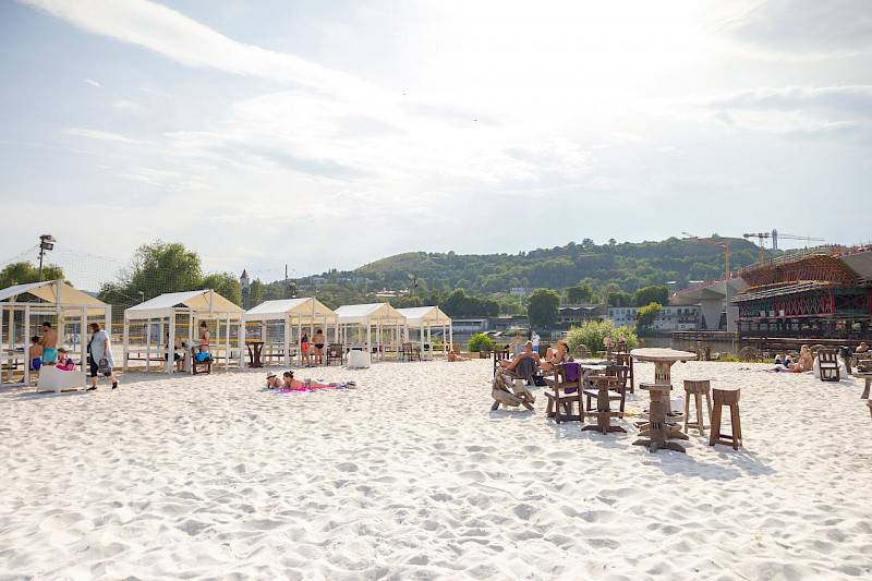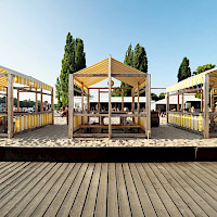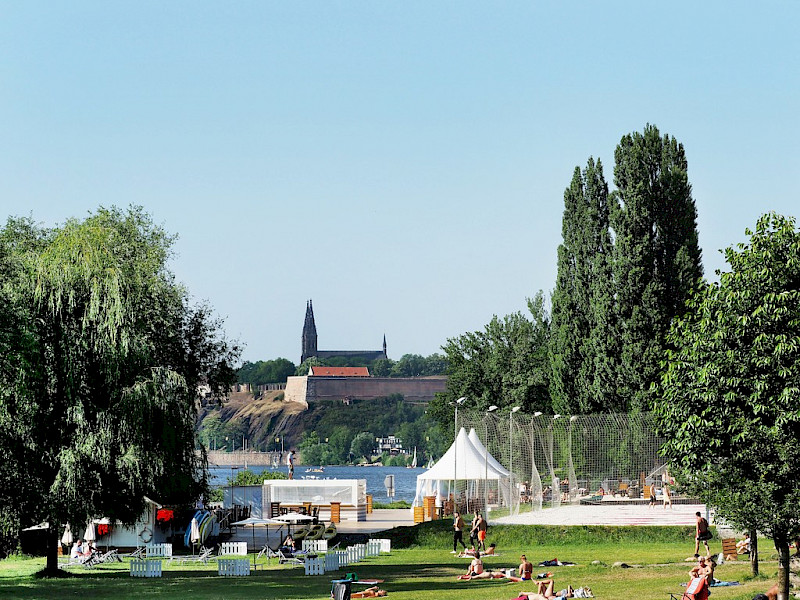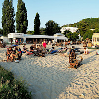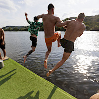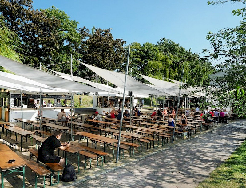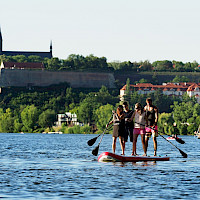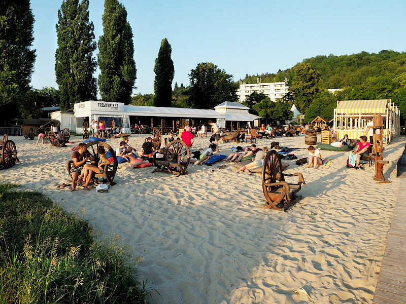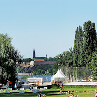 Travnaté prostory s posezením a sportovními aktivitami na břehu Vltavy. Vhodné pro party, prezentace, open-air promítání, svatby, oslavy.