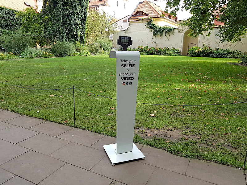 Stylový stojan s držákem na mobil, který z telefonu udělá mini fotostudio. Hosté jen zasunou svůj mobil, nastaví záběr a fotí, kolik chtějí. Nikdo nemusí stát mimo záběr.
